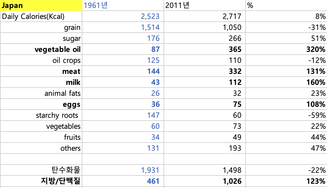 전체 칼로리 증가량도 별로 없고 전반적으로 50년 동안 증가폭이 높지 않은 편인데 일본 또한 육류와 우유, 달걀 섭취량 증가세가 비교적 높은 편이다.