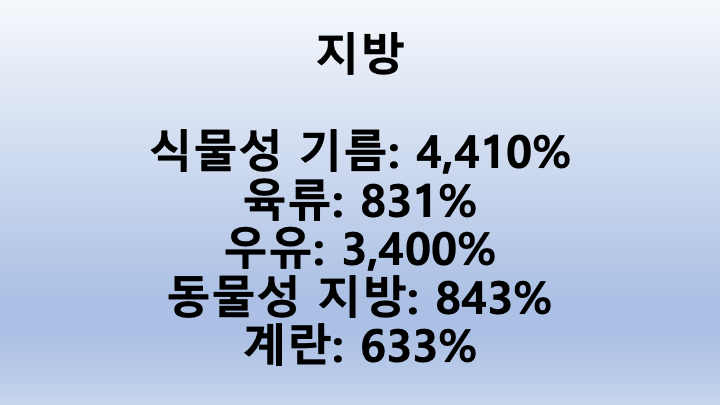 식물성 오일 154% 증가한 반면 동물성 오일은 49% 정도 줄었다. 건강을 생각한다면 당연한 결과일 것이다.
