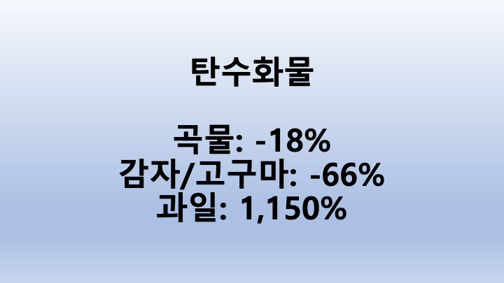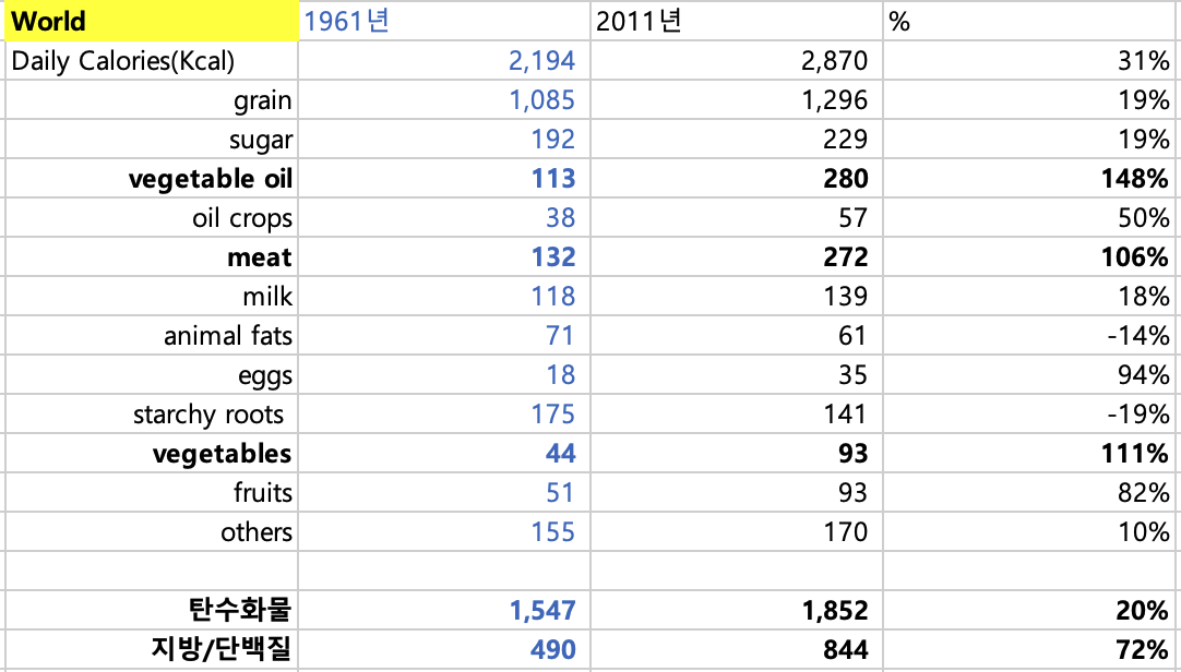 대략적으로(세부 자료가 없어서, 위 카테고리 기준으로 정리) 지난 50년 동안 탄수화물 섭취량이 20% 증가한 반면, 지방/단백질 섭취량은 72% 정도 증가했다.