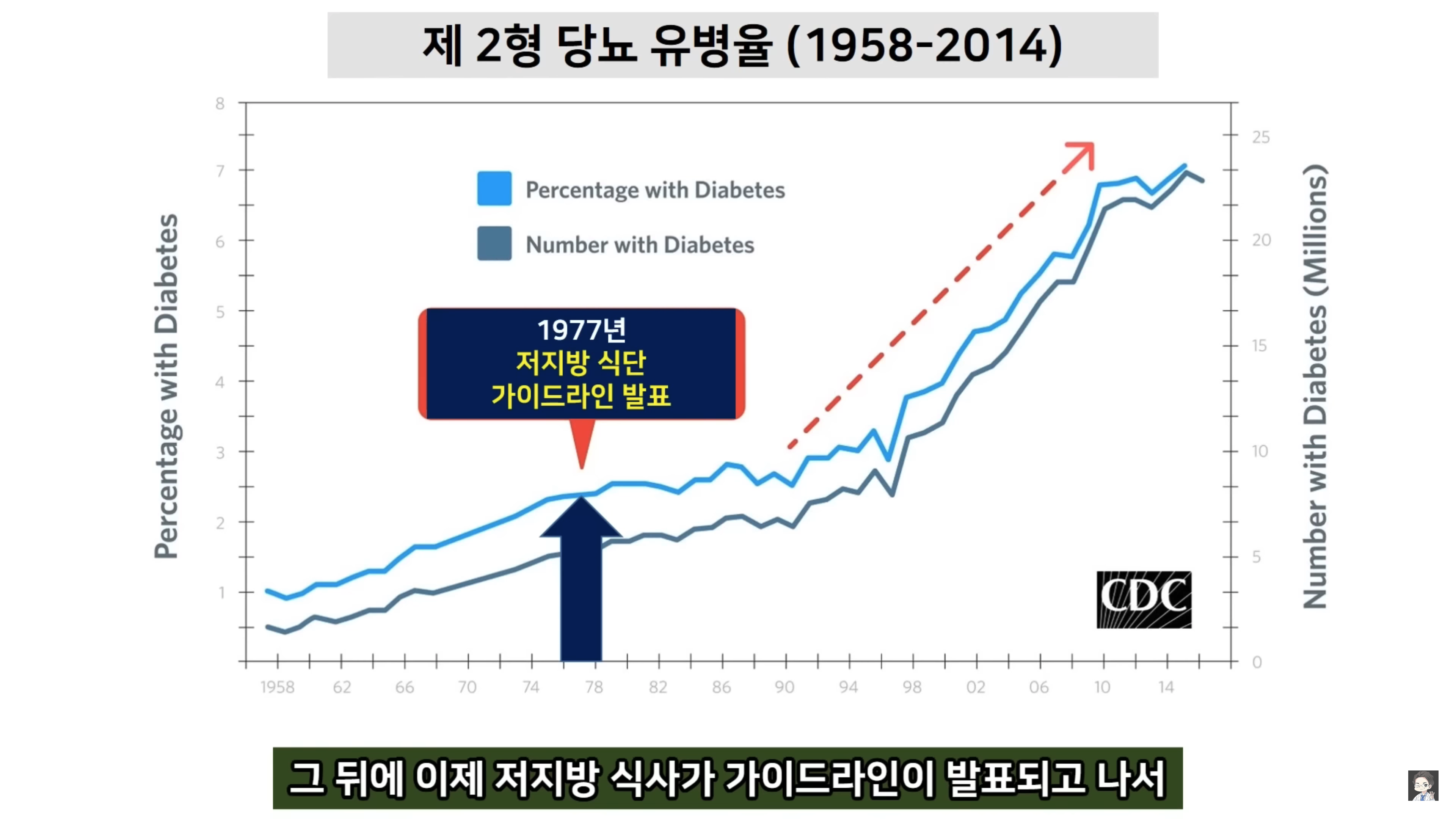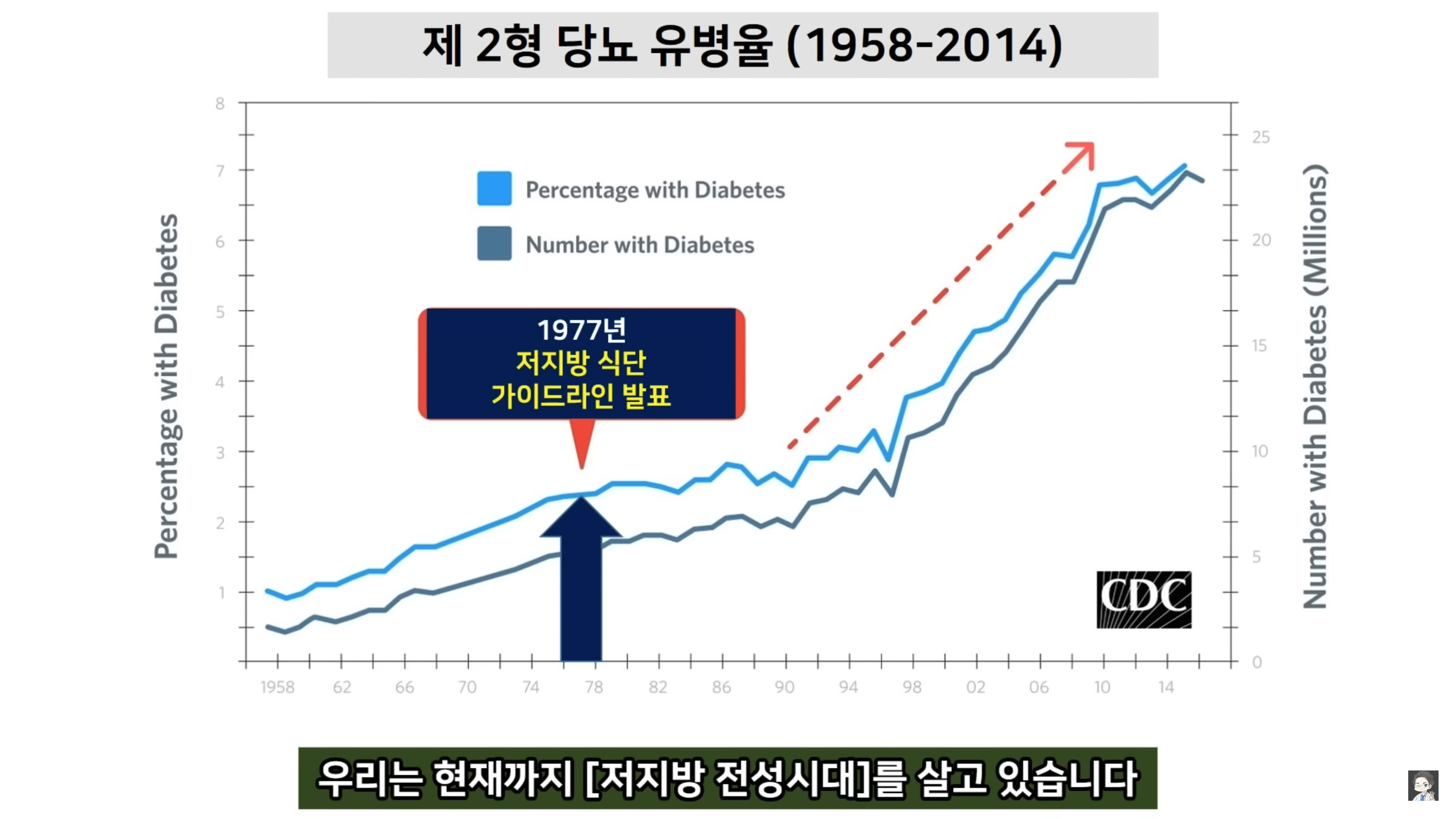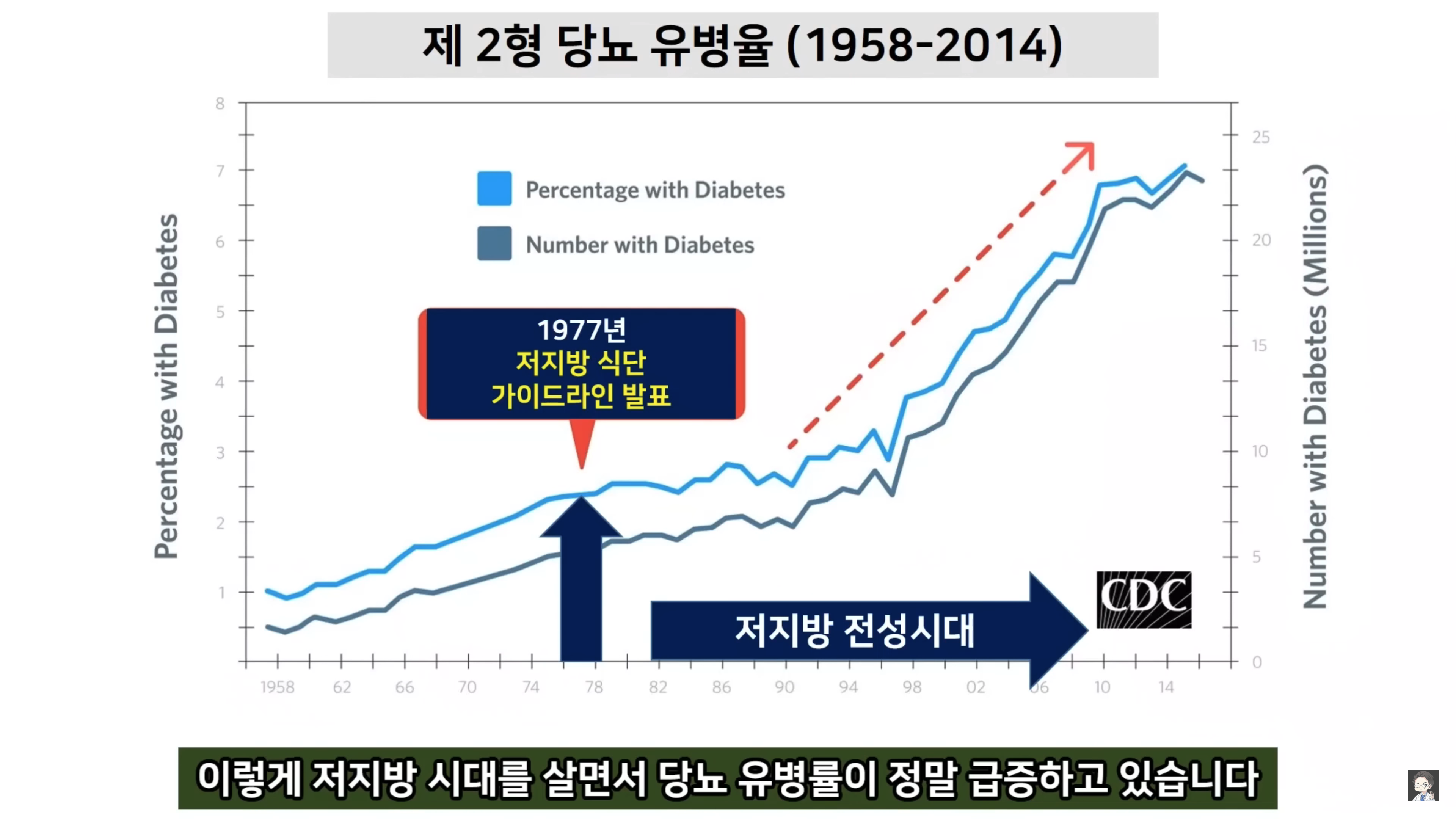 닥터쓰*라는 의사는 1977년 미국 정부에서 '저지방 식단 가이드라인'을 발표했기 때문에 당뇨, 치매 같은 질병이 급격하게 늘었다고 주장한다. 저지방 식단 가이드라인을 발표해서 저지방 전성시대를 살고 있다고 했다.