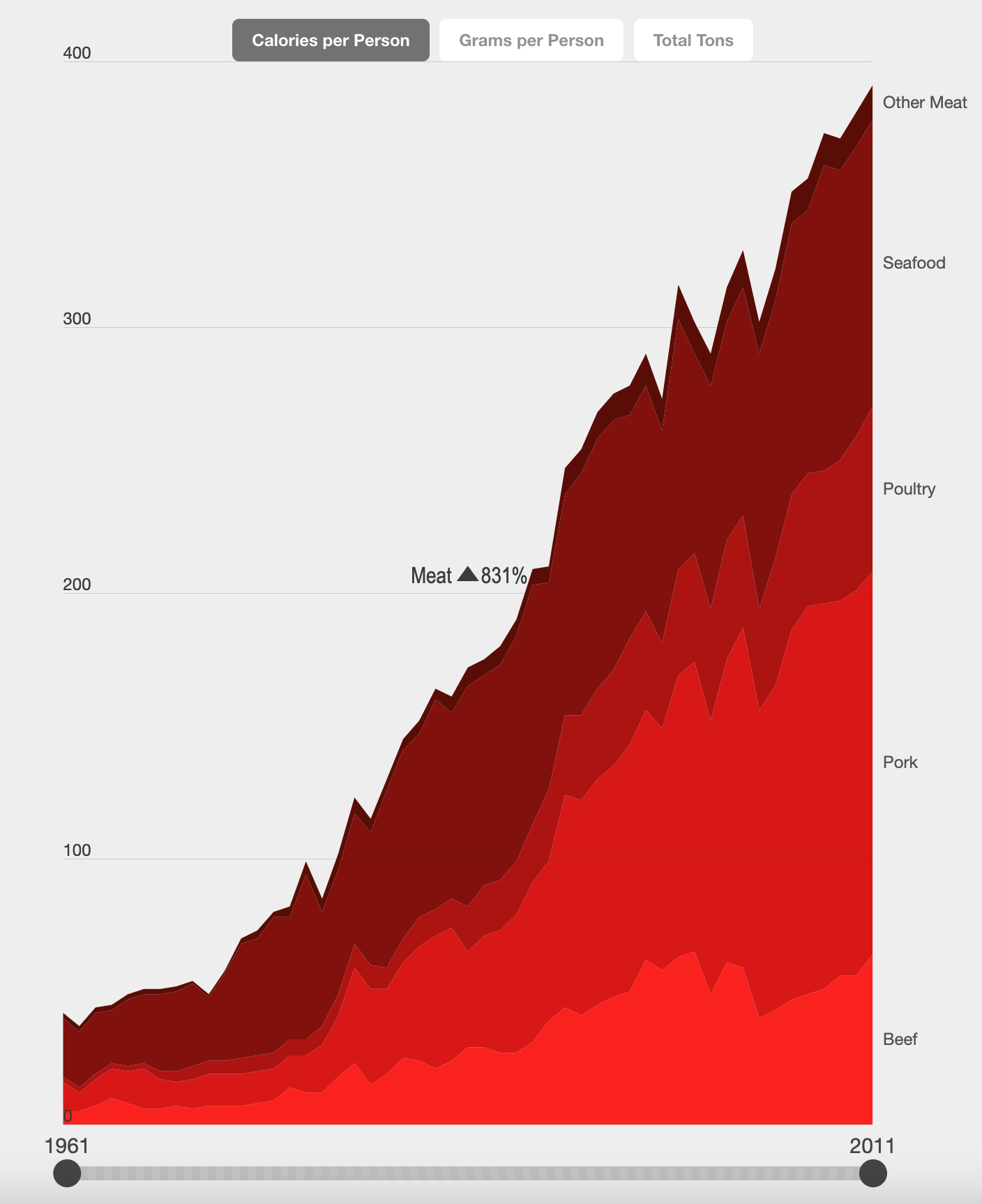 1961년부터 2011년까지 50년 동안 전세계 사람이 주로 먹은 것을 몇 가지 카테고리로 분류해서 정리했다. 굉장히 방대한 자료일 텐데 어떻게 조사를 했는지 신기할 따름이다. 전체를 볼 수는 없고 아주 간략히 정리해 보았다.