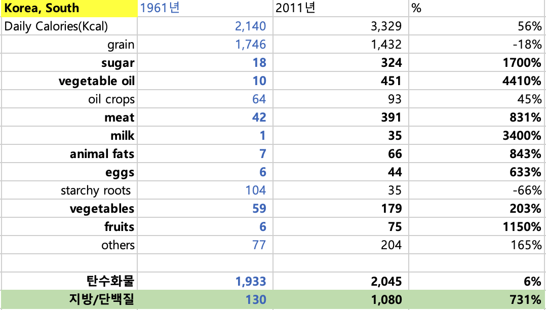 설탕 1,700%, 식물성 오일 4,410%, 육류 831%, 우유 3,400%, 동물성 지방 843%, 계란 633%, 과일 1,150% 정도로 엄청나게 증가했다는 것을 알 수 있다. 1961년이면 우리나라가 매우 가난한 시기였고 단기간에 높은 경제 성장을 이룩했으므로 어쩌면 당연한 결과일 수도 있다. 세계 평균, 일본이나 미국 대비 증가율이 가히 놀랍다.